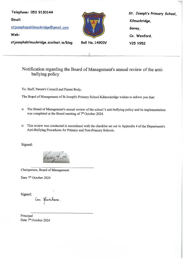 The Board of Management’s annual review of the school’s Anti-Bullying Policy and its implementation was completed at the Board meeting held on 7th October 2024.